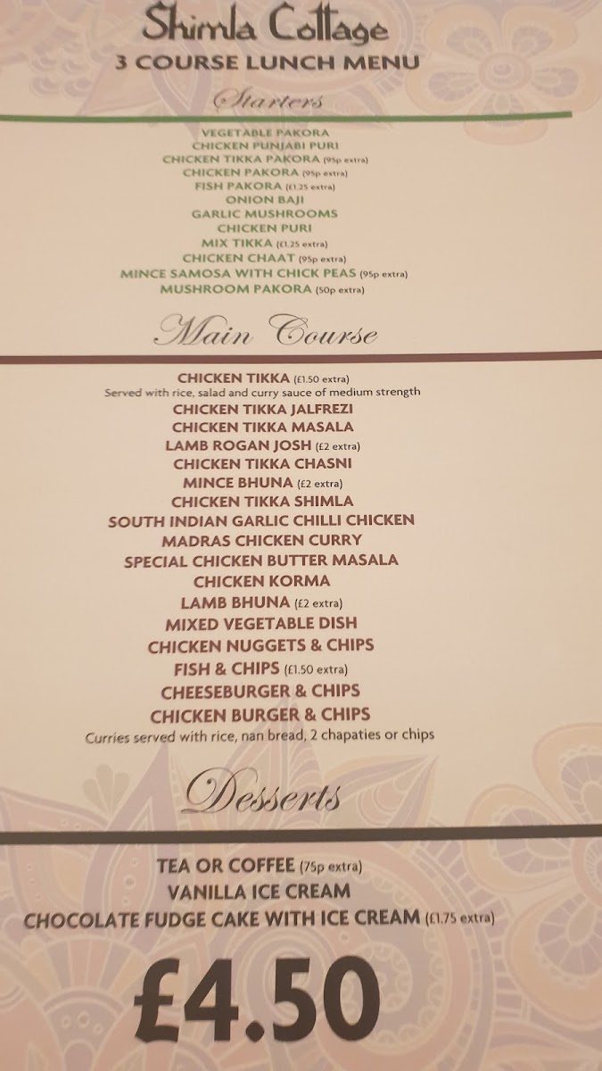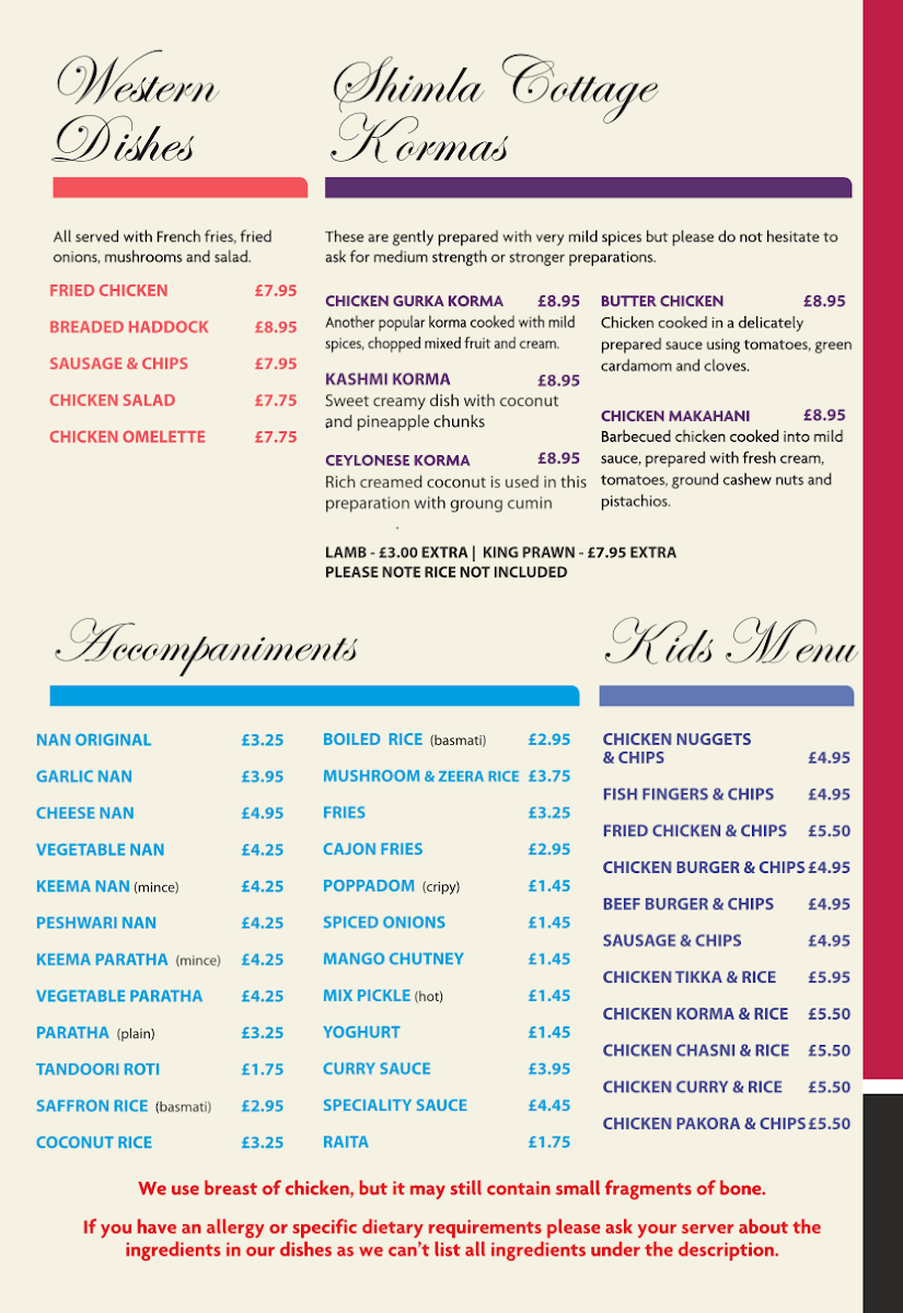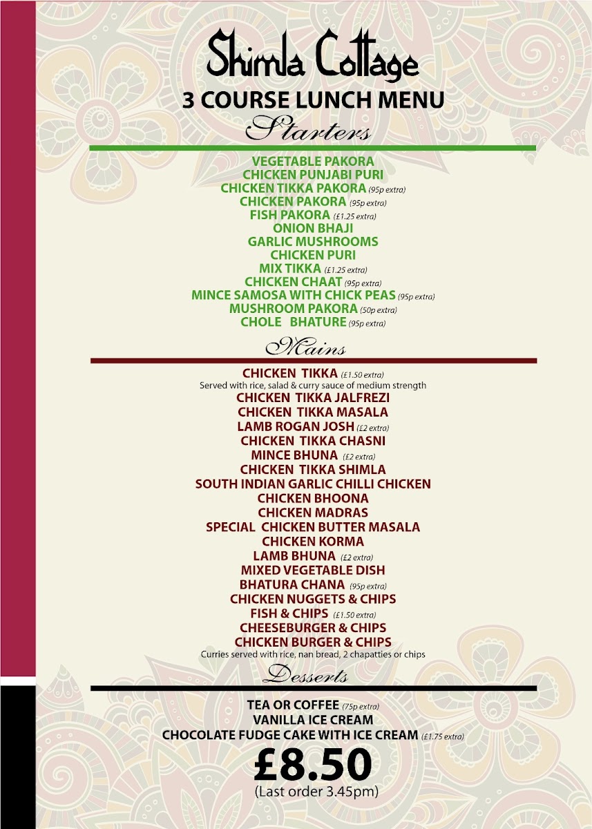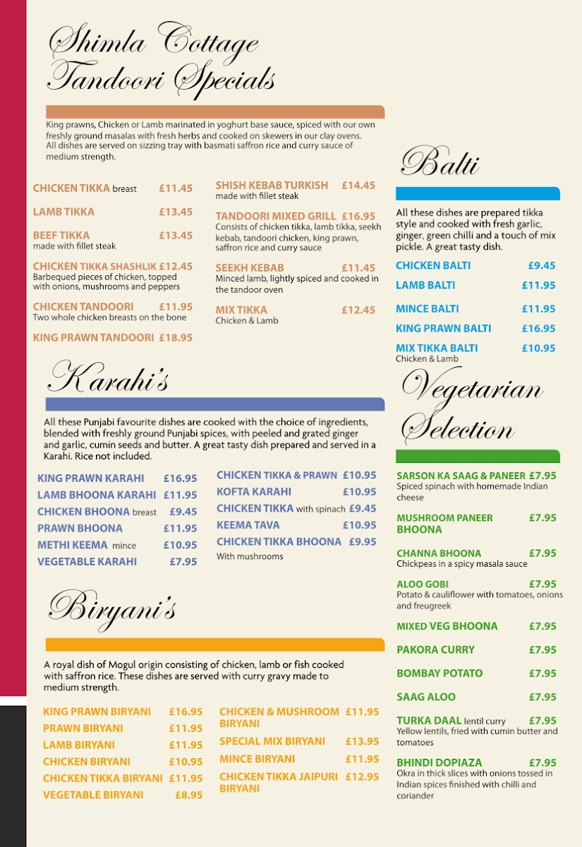 The Shimla Cottage Menu boasts an extensive array of dishes, with something for every palate. The starters, such as the crispy Onion Bhaji and juicy Chicken Tikka, set the stage perfectly, offering an explosion of flavor. The main courses are where the restaurant truly shines, with the Lamb Rogan Josh and Butter Chicken being standout choices. These dishes are rich in flavor, with the right balance of spices, ensuring that every bite is satisfying. Vegetarians will also find a range of excellent options, such as the Paneer Tikka and Aloo Gobi.