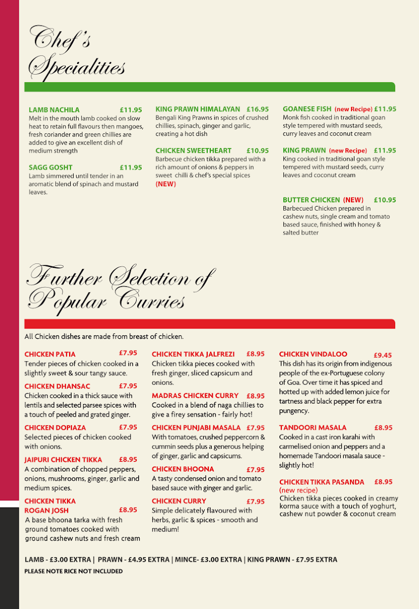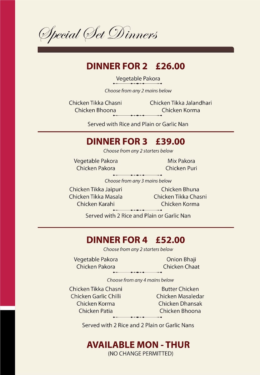Choose from any 2 starters below: Vegetable Pakora, Chicken Pakora, Mix Pakora, Chicken Puri. Choose from any 3 mains below: Chicken Tikka Jaipuri, Chicken Tikka Masala, Chicken Karahi, Chicken Bhuna, Chicken Tikka Chasni, Chicken Korma. Served with 2 Rice and Plain or Garlic Nan