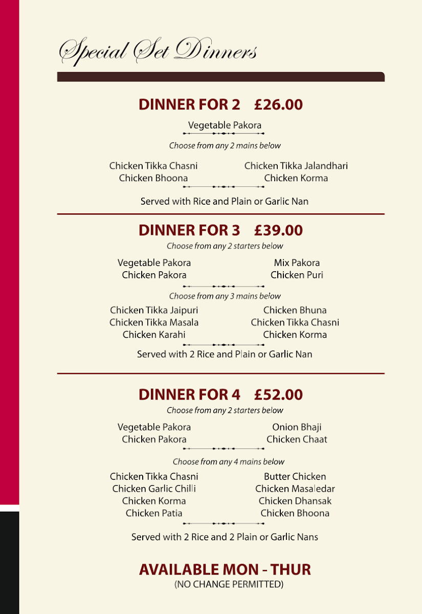 Choose from any 2 starters below: Vegetable Pakora, Chicken Pakora, Onion Bhaji, Chicken Chaat. Choose from any 4 mains below: Chicken Tikka Chasni, Chicken Garlic Chilli, Chicken Korma, Chicken Patia, Butter Chicken, Chicken Masaledar, Chicken Dhansak, Chicken Bhoona. Served with 2 Rice and 2 Plain or Garlic Nans